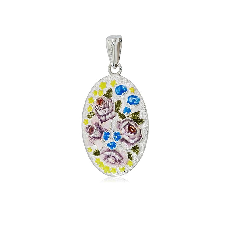 Серебряная подвеска овальная «Жостовский букет» (эмаль), белая