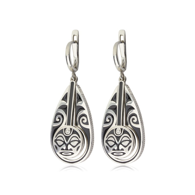 Серебряные серьги-подвески «Маори Жрец", выполнены из серебра 925 пробы по технологии горячего эмалирования, вставки – фианиты.