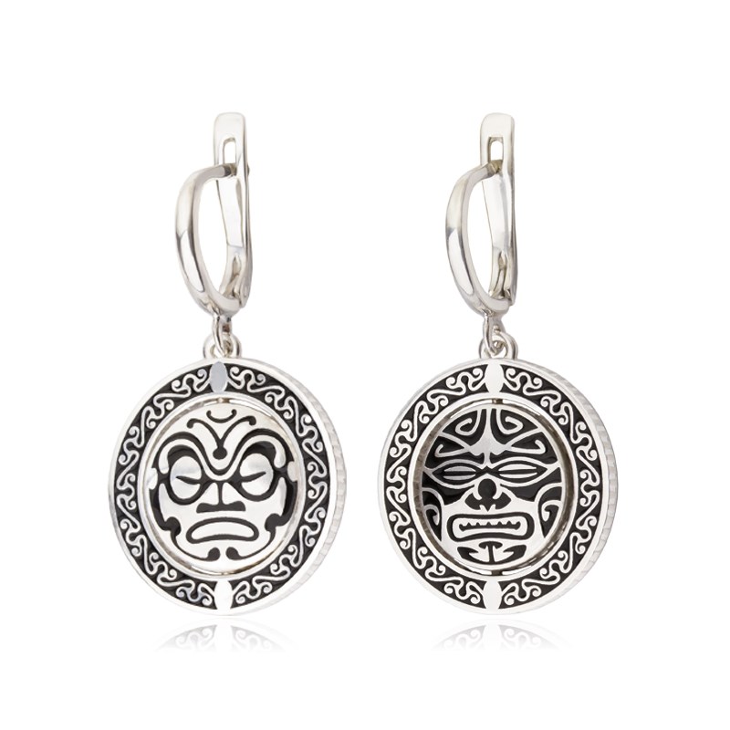 Серебряные серьги-подвески «Маори», лик воина, выполнены из серебра 925 пробы по технологии горячего эмалирования.