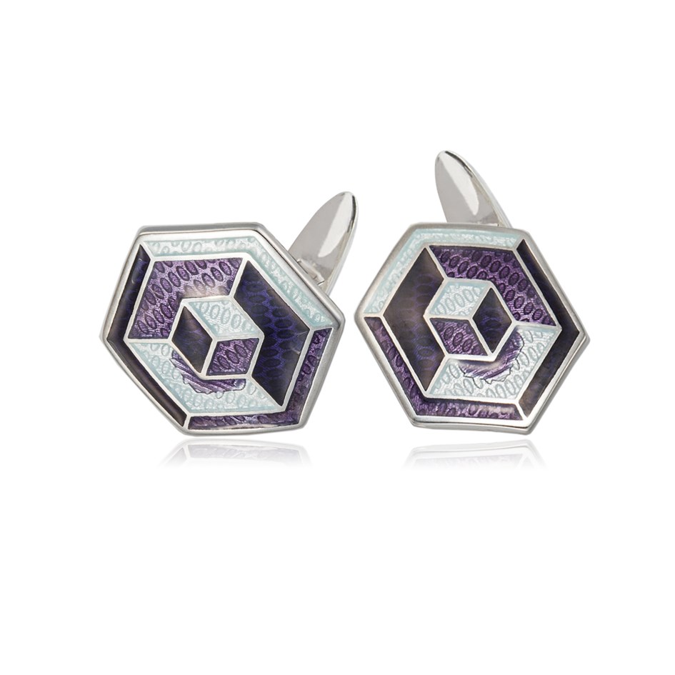 Серебряные запонки «Невозможные фигуры», кубическая абстракция, фиолетовые