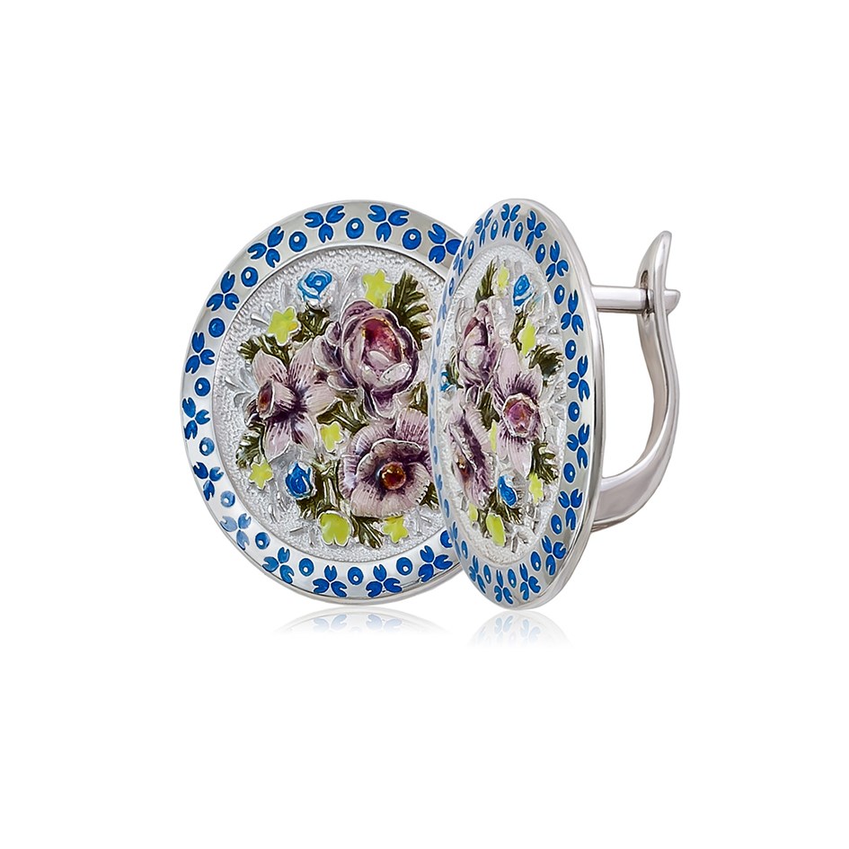 Эксклюзивные серьги из серебра 925 пробы выполнены по технологии горячего эмалирования. Украшение создавалось в этническом стиле со знаменитой на весь мир жостовской росписью. Ее главная особенность – объемные букеты пионов и нарциссов. Дополняет дизайн кайма с синими узорами на серебре. Прочный английский замок убережет от случайного расстегивания и потери украшений.