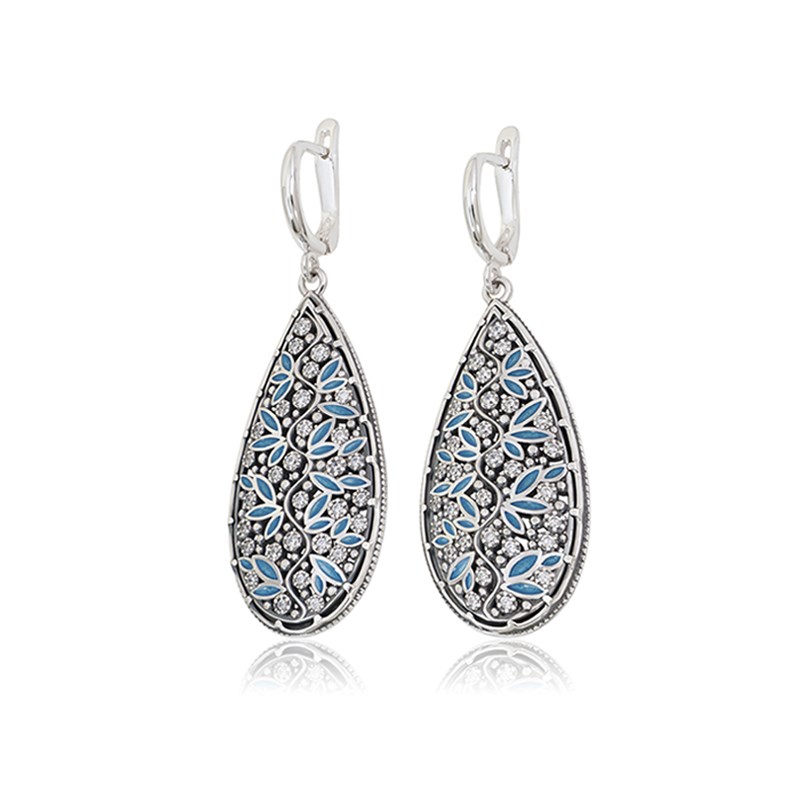 Роскошные каплевидные серебряные серьги с россыпью фианитов и изящными голубыми вкраплениями растительного орнамента. Используемая технология горячего эмалирования здесь подчеркивает блеск ювелирных камней, имитирующих капли росы, и придает украшению неповторимость. Такие сережки можно надеть по любому поводу – от самого прозаичного до торжественного.