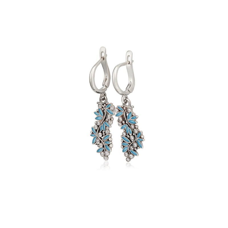 Серьги выполнены из качественного серебра 925-й пробы с эмалированием. Материал способен долгие годы сохранять сияние ажурных узоров и фианитов. В дополнение к этим оригинальным серьгам Вы можете приобрести кольцо и подвеску. Такой ансамбль украшений будет уместен как с кружевным платьем, так и с будничным нарядом.