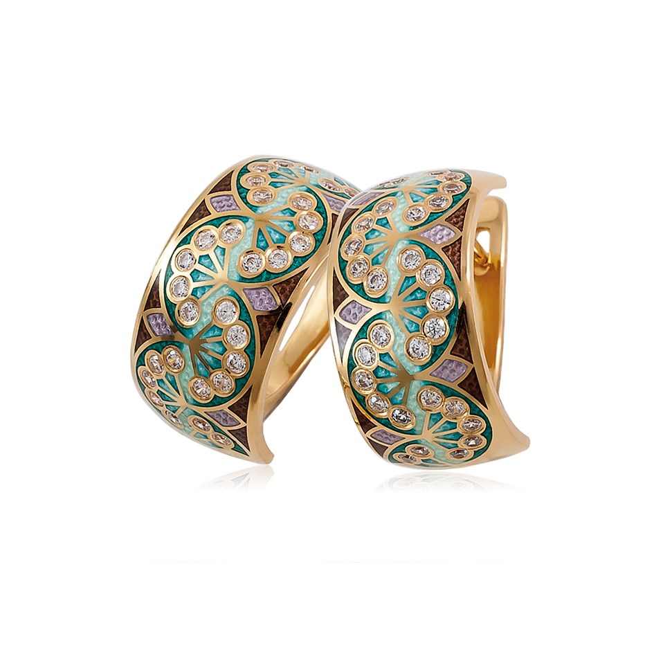 Серьги-полукольца «Сады Семирамиды» выполнены в серебре 925* с золочением 999* по технологии горячего эмалирования, вставки – фианиты.