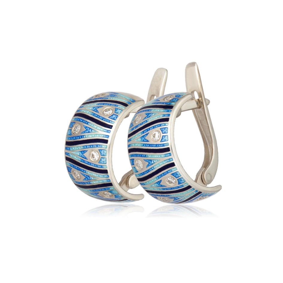Крупные яркие серьги из серебра 925 пробы, стилизованные под перо павлина. Орнамент нанесен по технологии горячего эмалирования, вставки- фианиты. Они прекрасно разбавят сдержанный деловой образ, а вечерний сделают еще роскошнее. Украшение изготовлено вручную по уникальному дизайну и не имеет аналогов. Застежка – английский замок.