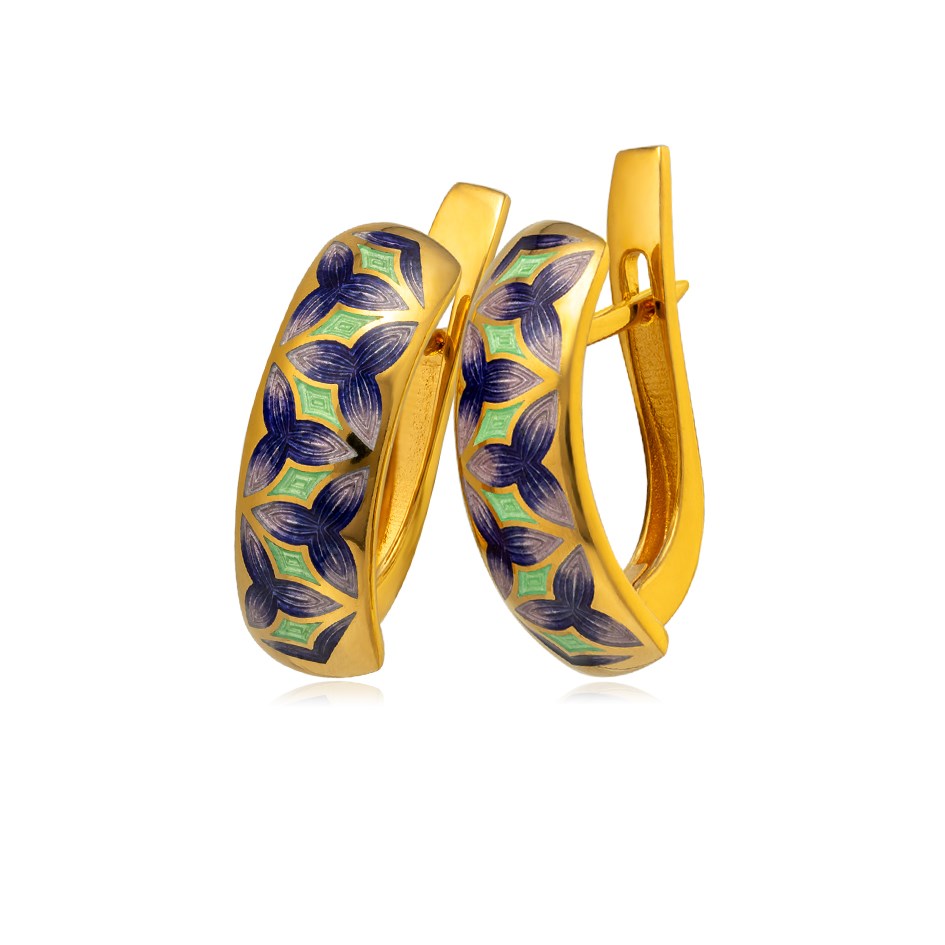 Оригинальные серебряные серьги с золочением и яркими вставками, выполненными по технологии горячего эмалирования. Геометрические орнаменты органично сочетаются между собой, образуя лепестки. Серьги выполнены в трех оттенках: фиолетовом, голубом и зеленом. Эти стильные авторские серьги гармонично впишутся в образ успешной женщины с тонким вкусом.