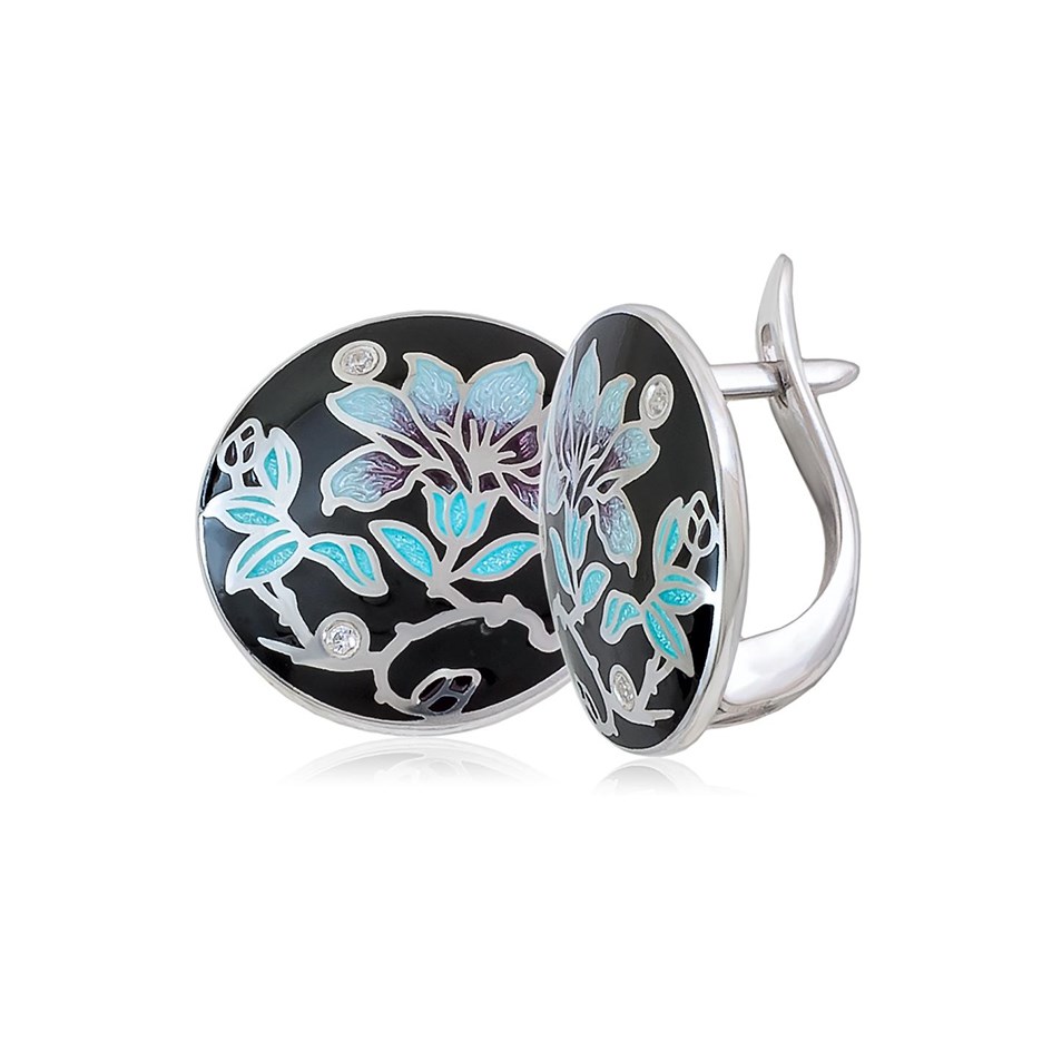 Уникальные серебряные серьги с флористическим дизайном, декорированные горячей эмалью. Удачное сочетание холодных оттенков и классическая форма делает украшение универсальным. Серьги дополнят как яркий вечерний образ, так и сдержанный деловой. Крепкая английская застежка убережет от случайной потери украшения. Серьги изготовлены мастерами ювелирной компании FILLART не имеют аналогов.