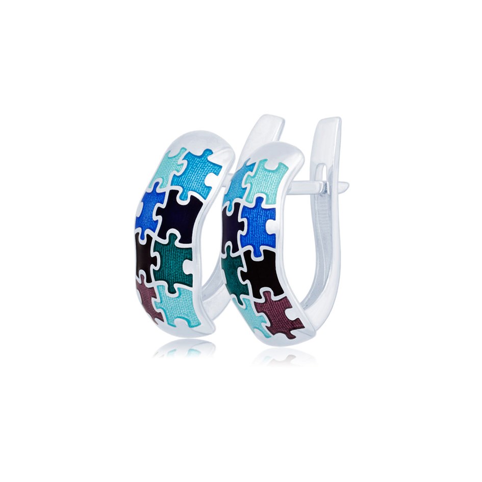 Эксклюзивные серьги-полукольца с эмалью в стиле наив-арт придутся по душе как юным девушкам, так и натурам творческим и смелым. Рисунок украшения в виде разноцветных пазлов выглядит мило и поднимает настроение. Серьги изготовлены по авторскому дизайну мастерами ювелирной студии FILLART.