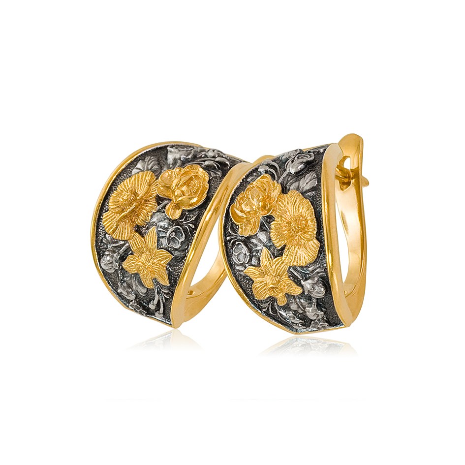 Серебро с чернением – классика, которая никогда не выйдет из моды. Благодаря специальной обработке поверхность украшений приобретает богатую фактуру, а рисунок становится более контрастным. Яркие золоченые цветы делают серьги еще более интересными и стильными. Серьги выполнены из серебра 925-й пробы с чернением, покрыты золотом 999-й пробы.