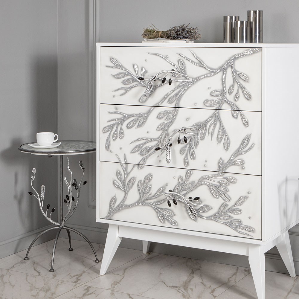 Красота и великолепие Олива – красивое дерево: «бархатным серебром» творческие натуры называют его листья, ведь в ветреную погоду нежная листва переливается серебристым цветом. Это завораживающее и волшебное зрелище. Не менее прекрасно цветение оливы: белоснежные кисти украшают дерево весной, радуют ярким цветением и магическим ароматом. Плоды оливкового дерева купаются в тёплых лучах, чтобы потом щедро одарить человека деликатесным вкусом и пользой драгоценного масла. Эстетическая уникальность Кованые элементы передают красоту и изысканность оливковой ветви, но при этом они сдержанные и элегантные. Эмоциональный дизайн Oliva Branch – необычная мебель, которую интересно наблюдать со всех ракурсов. Красиво детализированные природные формы вдохновляют и отображают творческий, экологичный образ жизни. Каждый декоративный элемент этой мебели – это заявление миру о нас, о том, как мы живем, что любим. Дизайн в эко-стиле – такой дизайн в интерьере позволяет прикоснуться к природе, благоприятно воздействует на человека и создает уютную атмосферу дома.