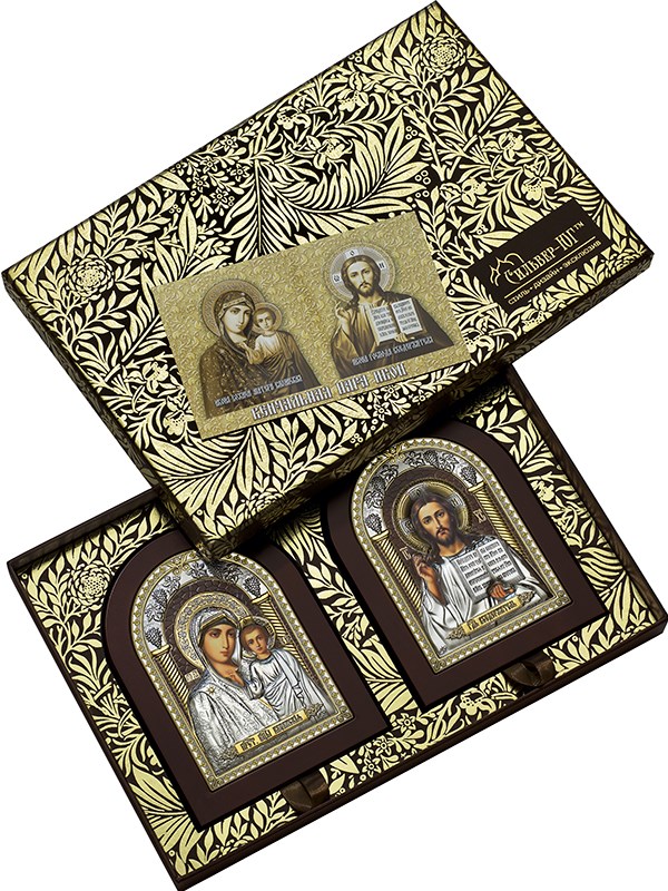 В православной традиции венчальную пару — образы Спасителя и Божией Матери с Младенцем — ставят в красный угол дома после таинства. Эти две иконы становятся духовным основанием семьи, к ним обращаются вместе, перед ними молятся о согласии и терпении. Здесь они выполнены в серебряном окладе с тонкой проработкой деталей, лики написаны мягко, взгляд Христа и Богородицы — спокойный, обращённый к молящимся. Футляр с растительным узором бережно хранит образы, их можно взять с собой в дорогу или поставить на полку — это удобно для тех, кто часто переезжает или живёт в съёмном жилье.