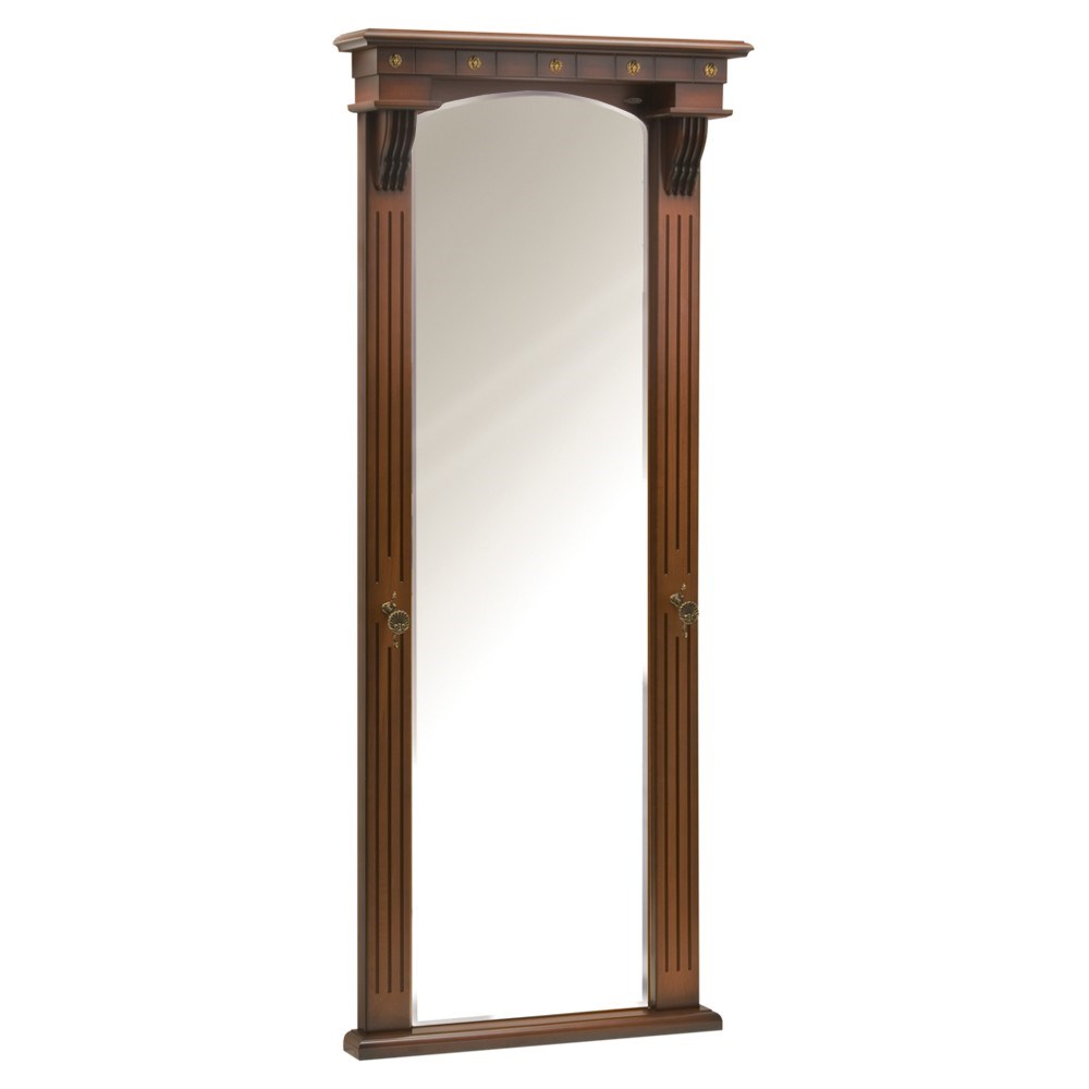 Зеркало напольное, с двумя декоративными крючками по бокам. Выполнено в классическом английском стиле. Главный функционал зеркала в полный рост – визуальное расширение пространства. Изделие отличается прочной устойчивой конструкцией и прослужит не один год! Материалы изготовления и размеры изделия Капитель выполнена из МДФ с декором в виде позолоченных мраморных медальонов с изображением львов (в комплекте 5 шт., по желанию клиент может заказать дополнительно). Фурнитура из латуни испанского производства (максимальная нагрузка 3 кг). Накладки с имитацией каннелюров выполнены из массива бука и представляют собой колонны. Зеркальное полотно из японских материалов, изготавливается в г. Москва. Крепится к стойке декоративными шурупами. РАЗМЕР ЗЕРКАЛЬНОГО ПОЛОТНА: 185,4см х 52,5см. Основание изготовлено из МДФ.