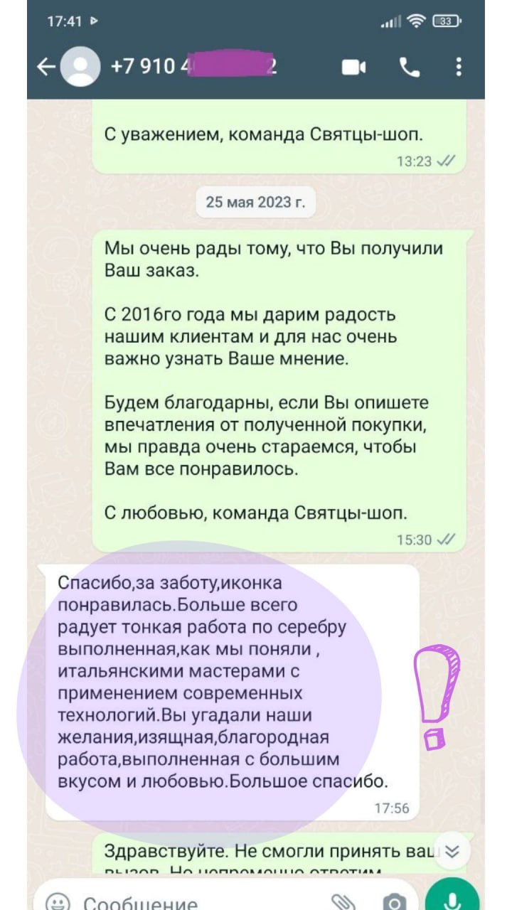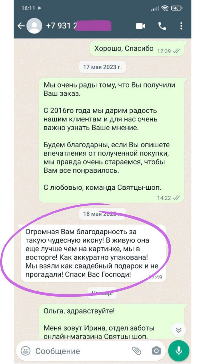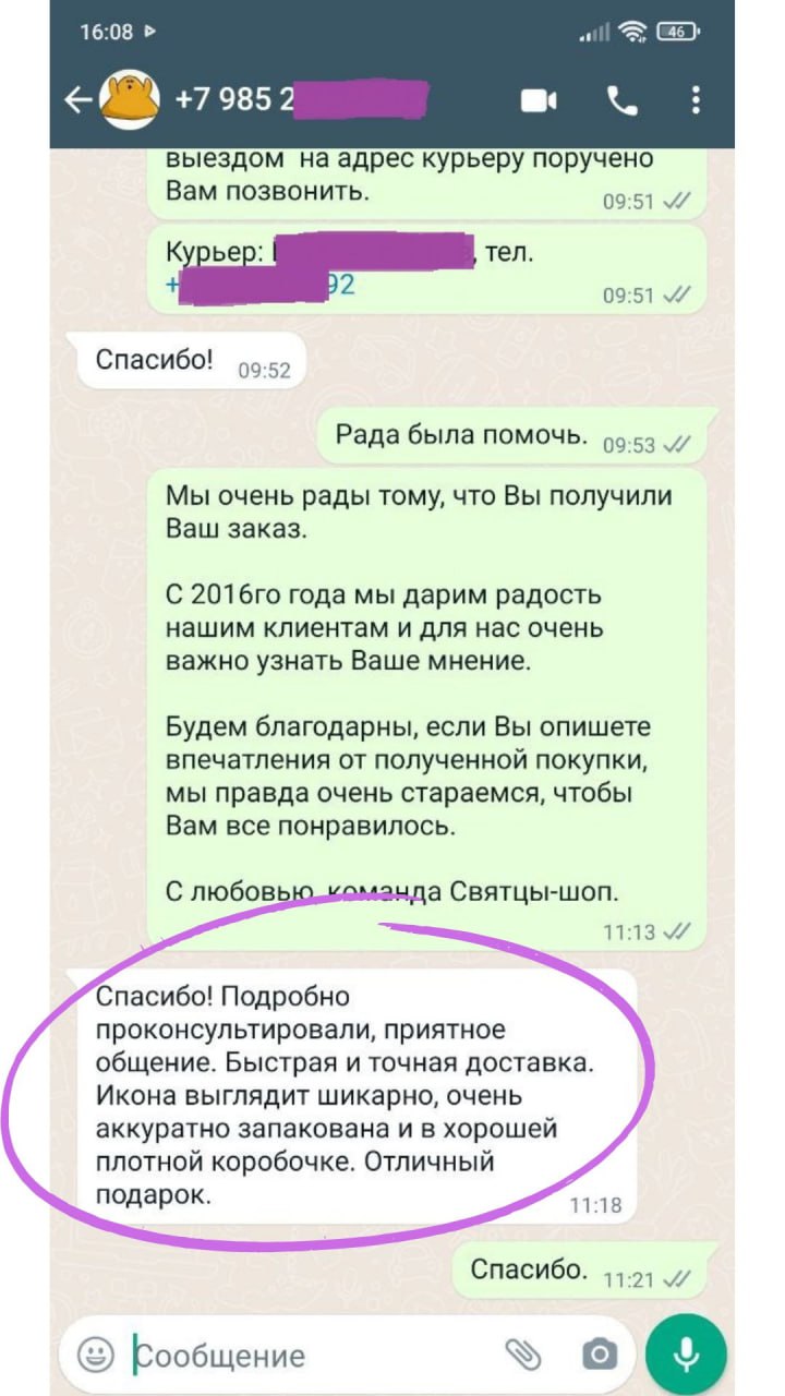Артикул: 241221), курьер был точен и вежлив, образок очень понравился, все качественно. Спасибо вашему оператору Светлане за внимание и старания сделать приятное клиенту. Успехов вашей команде и процветания.