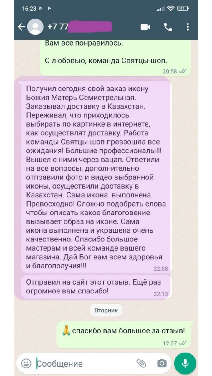 КириллПолучил сегодня свой заказ икону Божия Матерь Семистрельная. Заказывал доставку в Казахстан. Переживал, что приходилось выбирать по картинке в интернете, как осуществлят доставку. Работа команды Святцы-шоп превзошла все ожидания! Большие профессионалы!!! Вышел с ними через вацап. Ответили на все вопросы, дополнительно отправили фото и видео выбранной иконы, осуществили доставку в Казахстан. Сама икона выполнена Превосходно! Сложно подобрать слова чтобы описать какое благоговение вызывает образ на иконе. Сама икона выполнена и украшена очень качественно. Спасибо большое мастерам и всей команде вашего магазина. Дай Бог вам всем здоровья и благополучия!!!